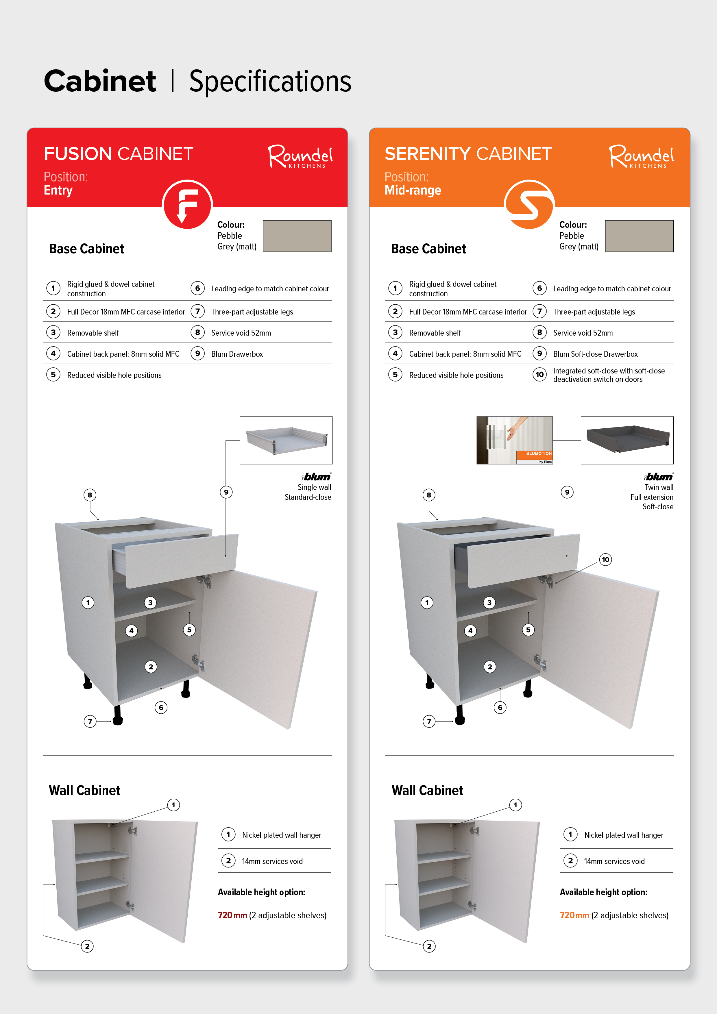 Made in the UK from sustainable materials, Roundel’s Fusion and Serenity cabinets deliver dependable, rigid cabinets with a fully glued and dowelled assembly for long-lasting strength. Fusion provides an accessible entry-level option that doesn’t skimp on quality. Stepping up, Serenity enhances the offering with colour-matched leading edges, Blum soft-close drawers, and integrated soft-close door hinges, blending everyday reliability with added features.